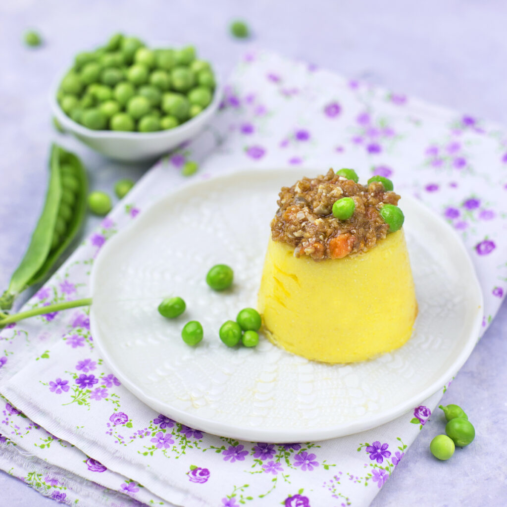 Porta a bollore dell’acqua (circa 630 g), versa a pioggia la farina da polenta e cuoci secondo quanto riportato nella confezione. Quando è pronta versa la polenta in 4 stampini bagnati e leggermente unti d’olio riempiendoli per metà, forma un incavo e aggiungi un cucchiaio di ragù, poi copri con altra polenta (se l’operazione risulta troppo complicata si può omettere, servendo le polentine con il ragù a fianco.