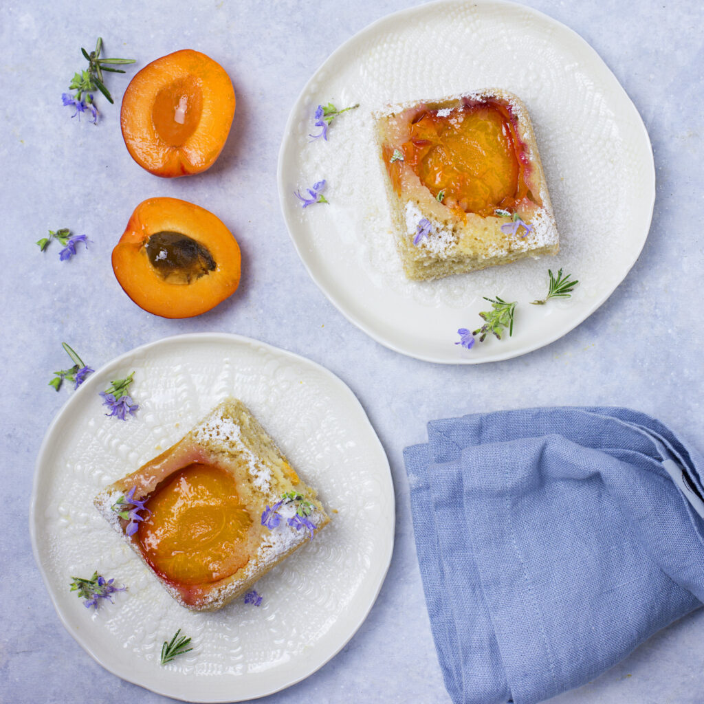 Lava ed asciuga le albicocche e dividile in due, elimina il nocciolo. Setaccia le farine con il lievito e il sale. Scalda leggermente l’olio e lascia il rosmarino in infusione.